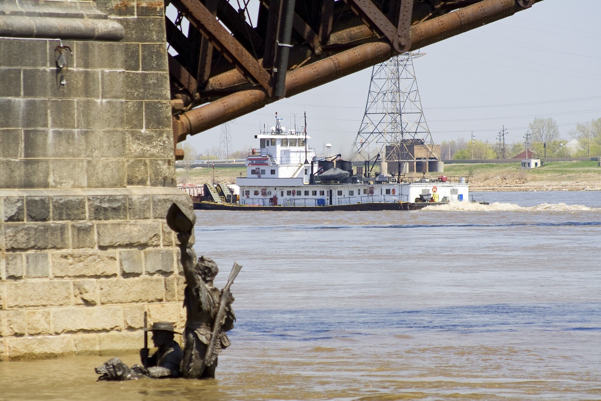Those barges are loaded with grain; they’ve come downriver from either the Illinois River or the Upper Mississippi River,  and they are bound for the large grain elevators near New Orleans, where they’ll be unloaded and the grain will most likely eventually be transferred to a ship for export. Because the tow is in St. Louis—this picture was taken from Eads Bridge—it will be soon be broken up and the barges put into a larger tow of 30–40 barges; the reason being that there are no more navigation locks below St. Louis, and the towing companies can make more money by putting more barges in front of bigger boats when not constricted by lock sizes.