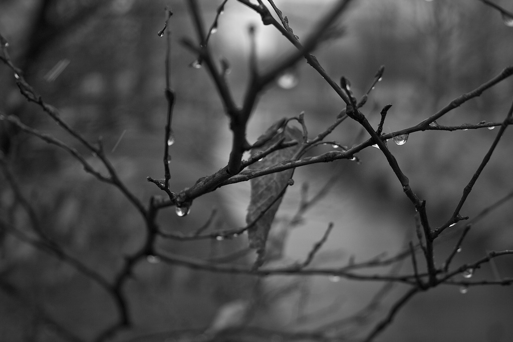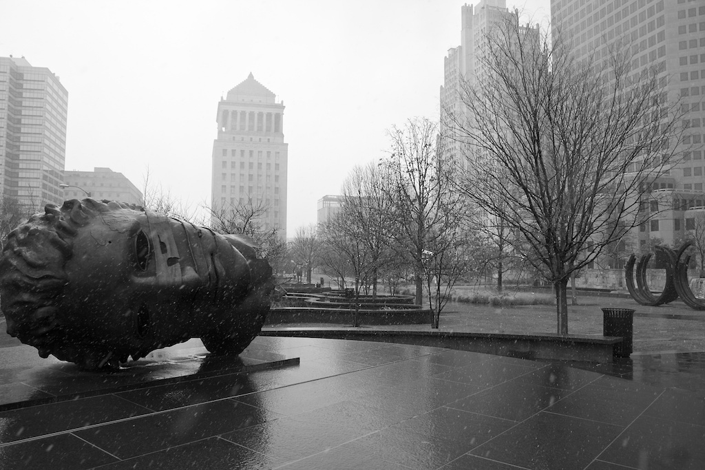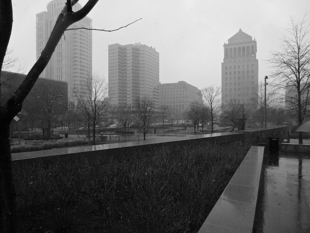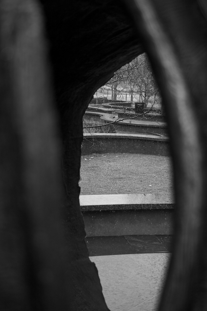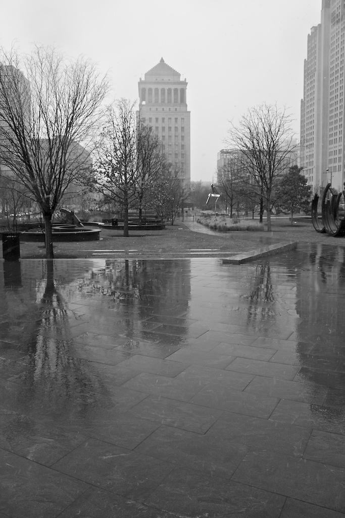 Temperature right around 32 degrees. Steady snow falling that felt, really, like rain. And a cold, cold wind whipping around between the city buildings. Not a great day for City Garden, and for much of the time that I walked through today, I was the only soul in sight. A perfect day for black and white.