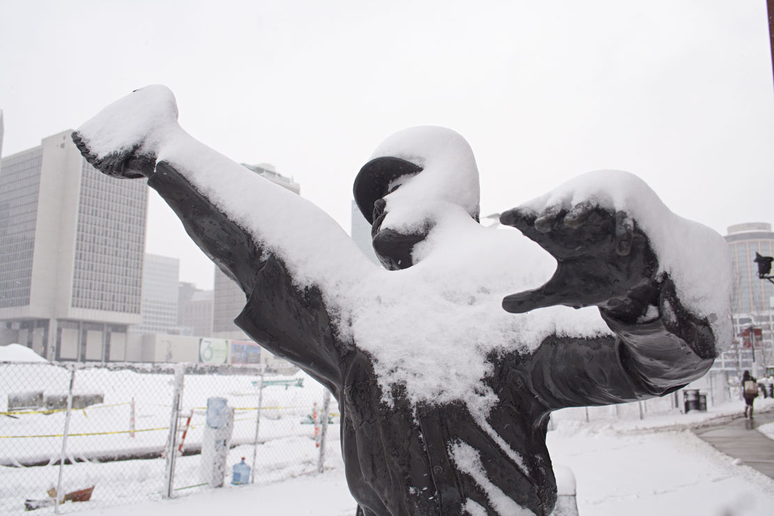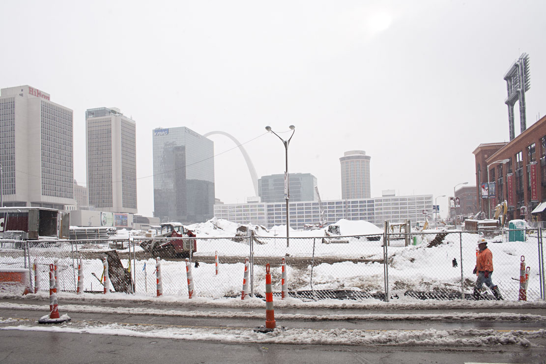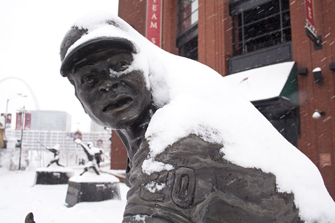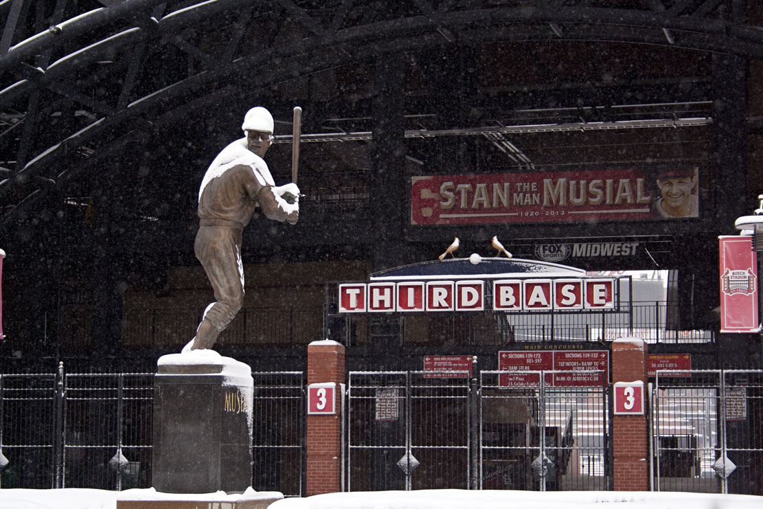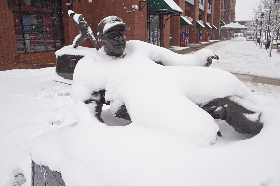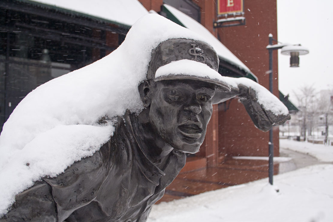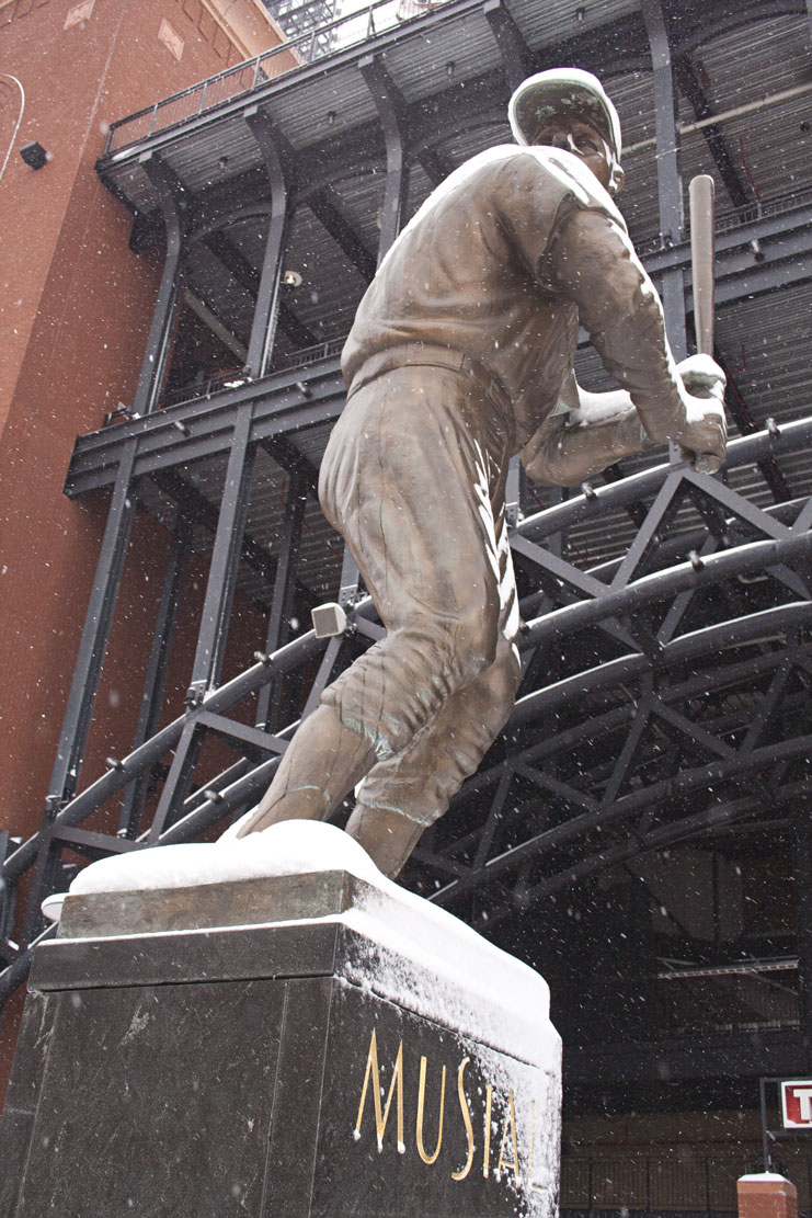 I had some time before work this morning, so I took a walk around downtown to take some pictures. I gravitated toward Busch Stadium to see how “Ballpark Village” is coming along, visit the statue garden, and see if the yard looked ready for baseball.